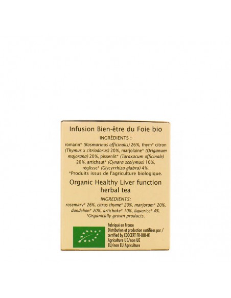 Rosmarino * (Rosmarinus officinalis) 26%, timo * limone (Timo x citriodorus) 20%, maggiorana * (Origanum majorana), 20%, dente di leone * (Taraxacum officinale) 20%, carciofo * (Cynara scolymus) 10%, liquirizia * (Glycyrrhiza glabra) 4%.