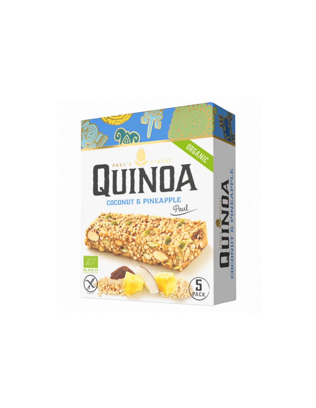 Le barrette di Paul's Quinoa sono prodotte con soli ingredienti biologici e certificati al 100% naturali. La base di "Pineapple & Coconut" è un mix di fiocchi di Quinoa, mandorle, nocciole, cocco e ananas.