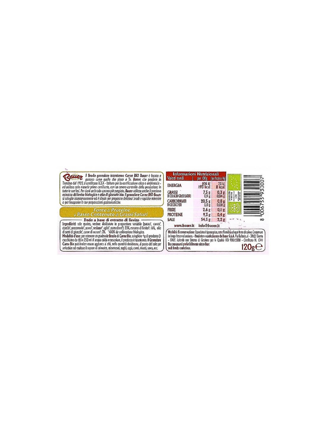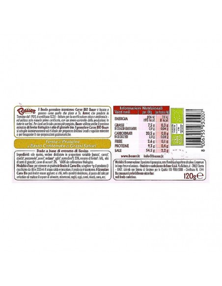 Pratico e versatile, il Granulare Carne Bio Bauer è ideale nella preparazione veloce di un brodo tradizionale da utilizzare in tante ricette, ma anche utilizzato come base di ottimi sughetti e ragù, o ancora come insaporitore di deliziosi spezzatini, polpette e altri secondi piatti a base di carne. Speciale granulazione che garantisce solubilità immediata.