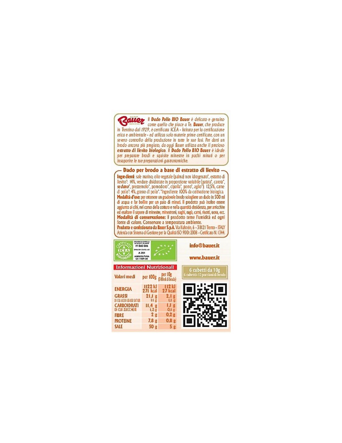 Sale marino, olio vegetale non idrogenato (palma)*, estratto di lievito*: 14%, verdure disidratate in proporzione variabile (patata*, carota*,sedano*, prezzemolo*, pomodoro*, cipolla*, porro*, aglio*): 12,5%, carne di pollo*: 4%, grasso di pollo*.