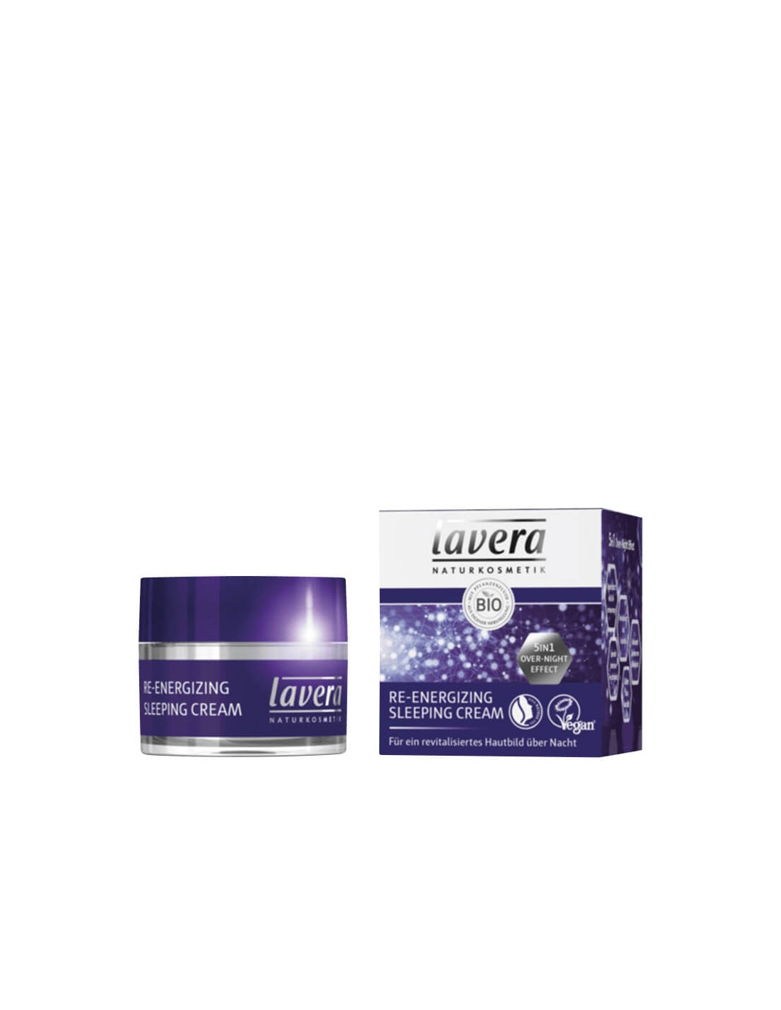 Quotidianamente la pelle è sottoposta a stress e attaccata da agenti ambientali esterni. Per riparare a ciò, la Re-energizing sleeping cream, entra in azione con ben 5 azioni in 1 durante la notte. L'olio di Mandorla, l'olio di Oliva, l'acido ialuronico, i Saccaridi, gli estratti di Uva e la vitamina E agiscono insieme per supportare la rigenerazione cellulare e combattere i segni della stanchezza.